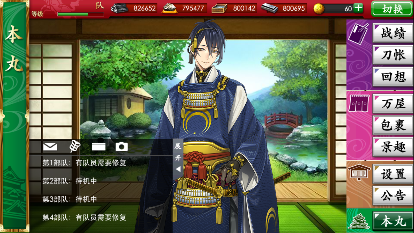 点击本丸画面左下方的“展开”按钮,不仅能看到目前的部队状态,还能收取邮件、参加活动及使用“御伴”功能。