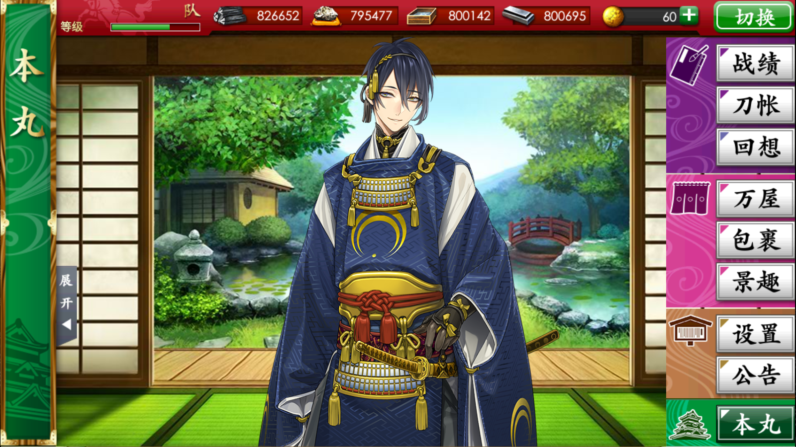 玩家可以在游戏中的“本丸”(游戏主界面)右侧查看主菜单。