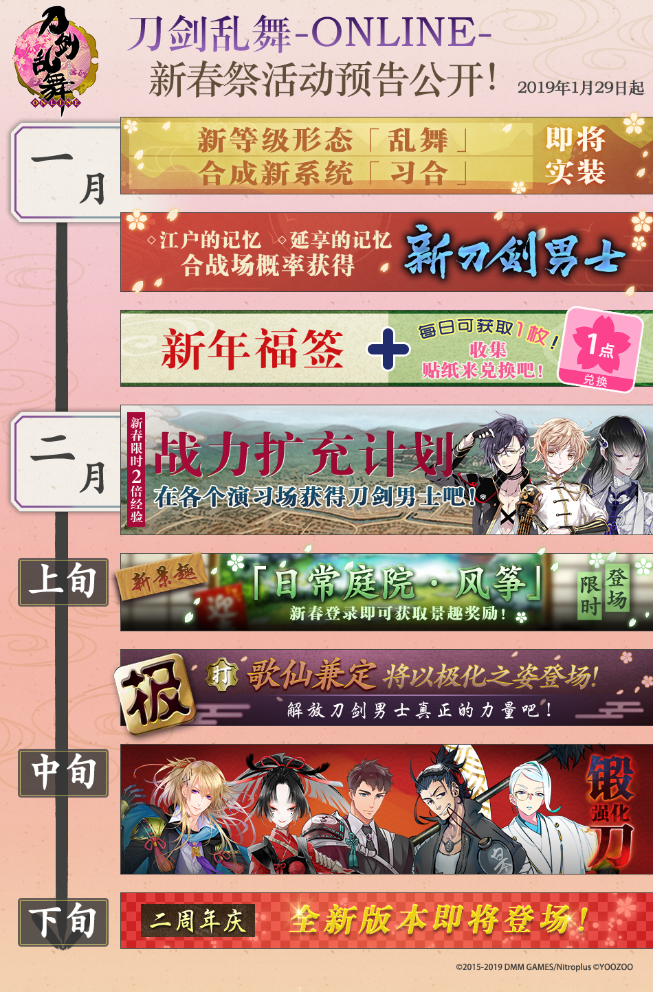 新春祭过后,《刀剑乱舞-ONLINE-》中文版二周年庆版本将紧接着拉开帷幕。豪华登录奖励、全新刀剑男士、多倍经验庆典……更有神秘活动内容等待揭晓!后续详情敬请留意官方微博、微信公众号及官网消息!
