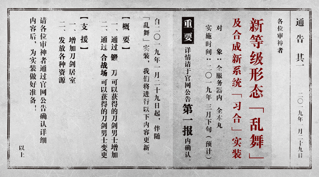 《刀剑乱舞-ONLINE-》中文版预计将在2019年3月实装新等级形态「乱舞」以及合成新系统「习合」。