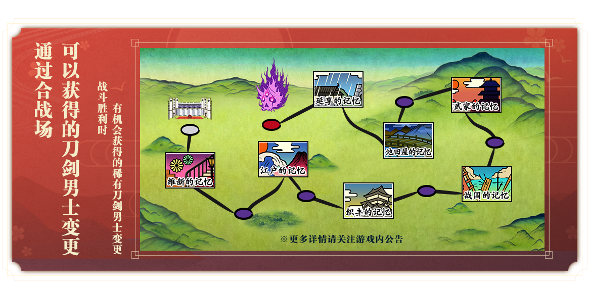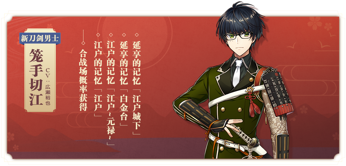 1月28日更新完成后,从未在中文版出现过的全新刀剑男士【胁差·笼手切江】将于合战场登场!在江户的记忆「江户」、江户的记忆「江户~元禄~」、延享的记忆「白金台」与延享的记忆「江户城下」四个合战场中进行战斗,将有概率与新刀剑男士相逢。