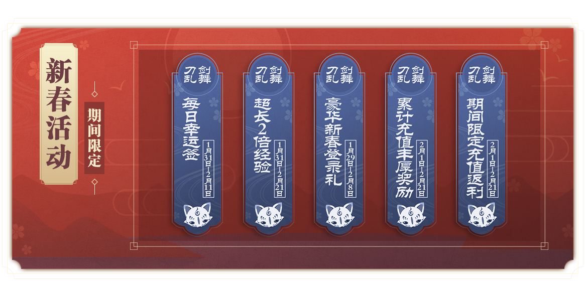 豪华新春登录礼 1月28日更新后至2月8日23:59,凡是累计90日未登录的审神者,只要在以上活动期间内任意一天登录游戏,即可领取“回归登录奖励”1份。另一方面,只要在1月29日0:00至2月4日23:59期间登录过游戏的审神者,都可在2月5日0:00至2月8日23:59期间任意一天登录游戏领取“活跃登录奖励”1份。请于邮箱内确认资源奖励内容。
