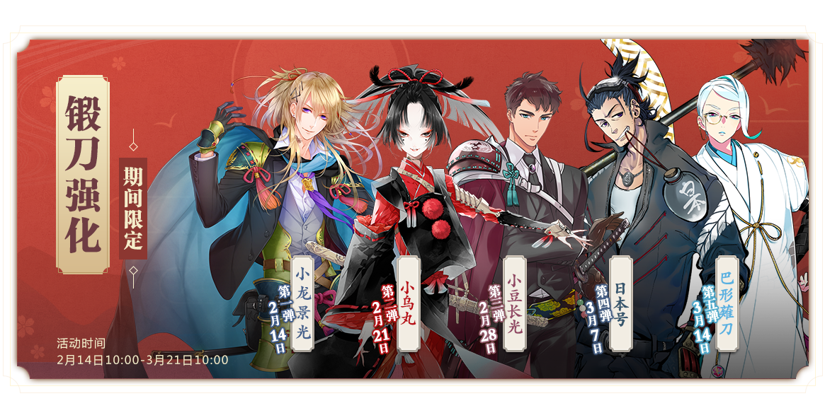 从2月14日10:00起,将接连开启一系列的刀剑锻刀强化活动。活动期间,使用特定公式进行刀剑锻造,将比通常锻刀更容易获得对应的刀剑男士。后续详情敬请关注官方微博、微信公众号及官网公告!