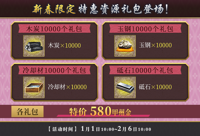 【活动详情】活动期间,4款新春限定特惠资源礼包将上架万屋特卖。木炭10000个礼包内含木炭*10000;玉钢10000个礼包内含玉钢*10000;冷却材10000个礼包内含冷却材*10000;砥石10000个礼包内含砥石*10000。以上各礼包新春限定售价均为580甲州金。