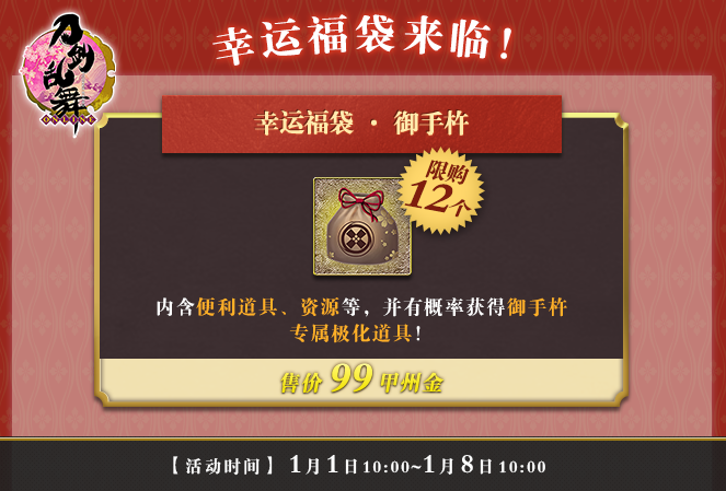 【活动详情】活动期间,万屋将上架御手杵幸运福袋。开启专属极化道具幸运福袋,有机会获得资源、便利道具、刀装和刀剑男士专属极化道具。幸运福袋售价99甲州金/个,限购12个,开启全部12个福袋必得一套对应刀剑男士的专属极化道具。