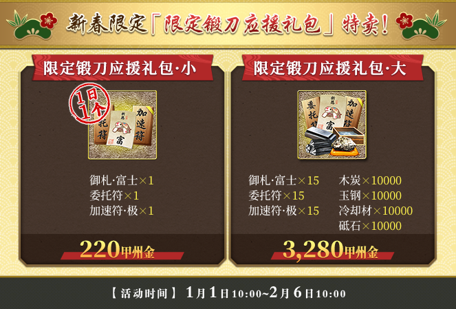 【活动详情】活动期间,新春特别限定锻刀应援礼包上架万屋特卖。限定锻刀应援礼包·小内含“御札·富士*1、委托符*1、加速符·极*1”,特惠售价220甲州金,每日限购1个。限定锻刀应援礼包·大内含“御札·富士*15、委托符*15、加速符·极*15、木炭*10000、玉钢*10000、冷却材*10000、砥石*10000”,特惠售价3280甲州金。