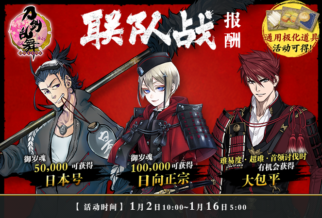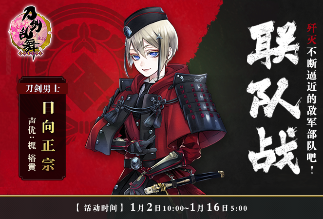 【活动详情】活动期间参与联队战,收集「御岁魂」,可获得对应奖励,包括极化道具和刀剑男士——「短刀·日向正宗」。