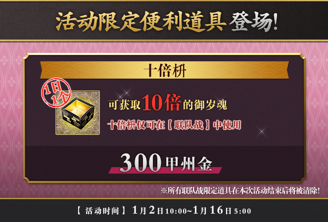 【活动详情】活动期间内,万屋将上架联队战限定活动便利道具「十倍枡」。在确认出阵前,若审神者选择使用「十倍枡」,则本轮出阵结束后将获得十倍数量的「御岁魂」。该道具只能在联队战活动中使用。每个「十倍枡」售价300甲州金,每日限量购买1个。