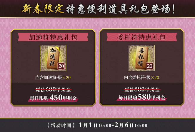 【活动详情】活动期间,新春限定特惠便利道具礼包上架万屋特卖。加速符特惠礼包内含“加速符·极*20”,原价600甲州金,新春特别优惠售价450甲州金,每日限购3个。委托符特惠礼包内含“委托符*20”,原价800甲州金,新春特别优惠售价580甲州金,每日限购3个。