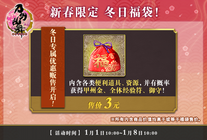 【活动详情】活动期间在“万屋-特卖”购买3元现金冬日福袋,必得各类便利道具或资源。审神者有机会开出甲州金、经验符、全体经验符、御札、御守等超值商品,所有内含商品价值均高于或等于福袋售价。