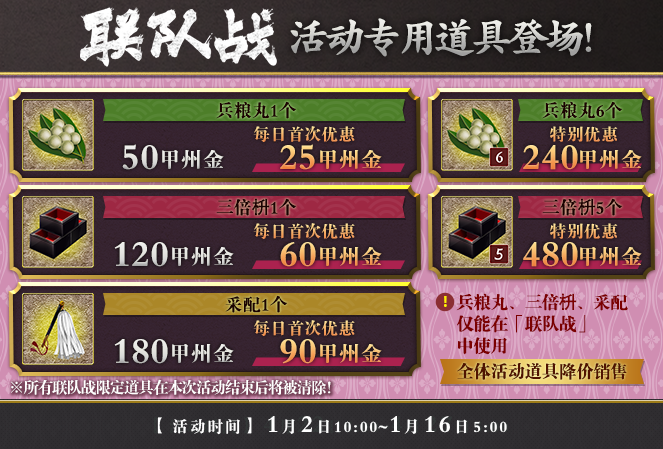 ※所有联队战限定道具在本次活动结束后将被清除,无法在下次活动开启时使用。请审神者合理安排购买及使用。
