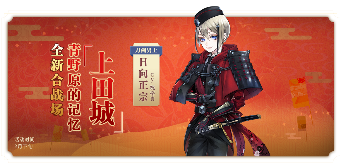全新合战场——青野原的记忆「上田城」实装。击败合战场首领,有机会获得刀剑男士「短刀·日向正宗」。