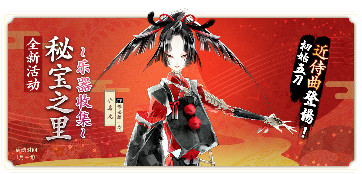 全新活动「秘宝之里~乐器收集~」实装,初始五刀近侍曲率先登场。收集「玉」达到一定数量,即可获得刀剑男士「太刀·小乌丸」。