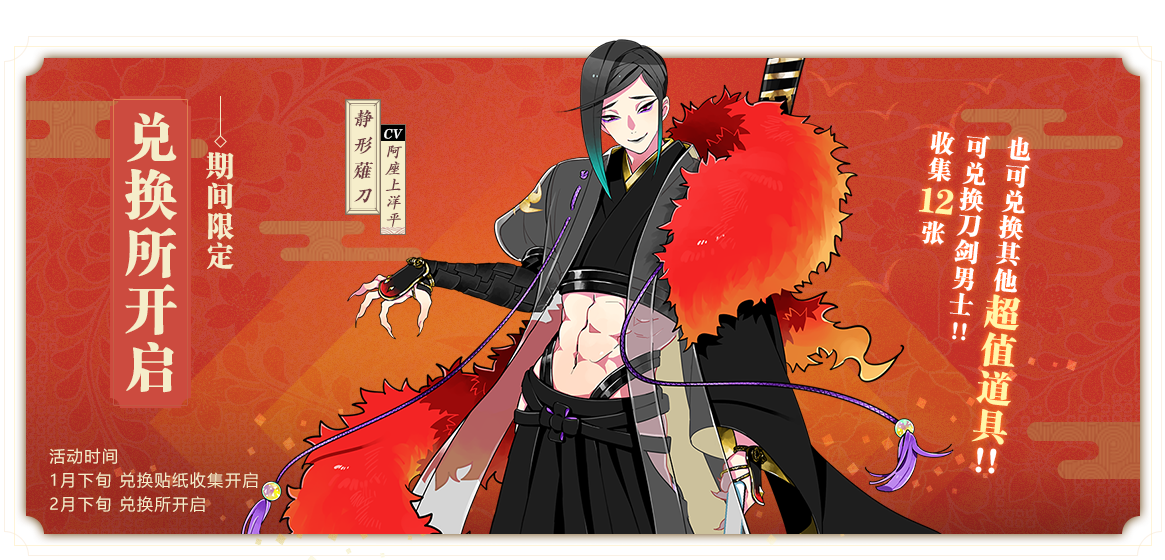 1月下旬,兑换贴纸收集开启。2月下旬,中文版三周年兑换所将开启。收集12张兑换贴纸,可兑换心仪的刀剑男士,也可兑换其他超值道具。