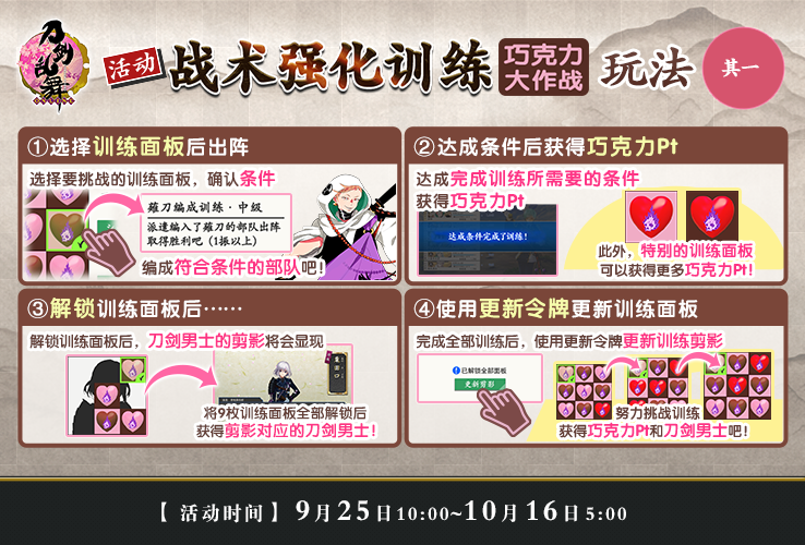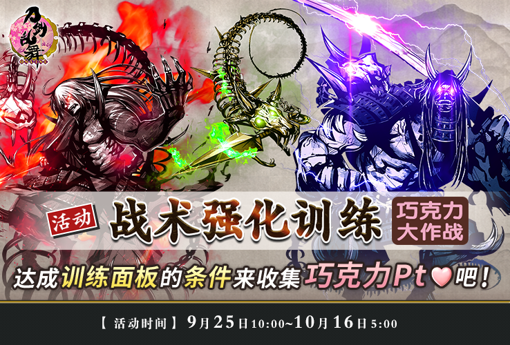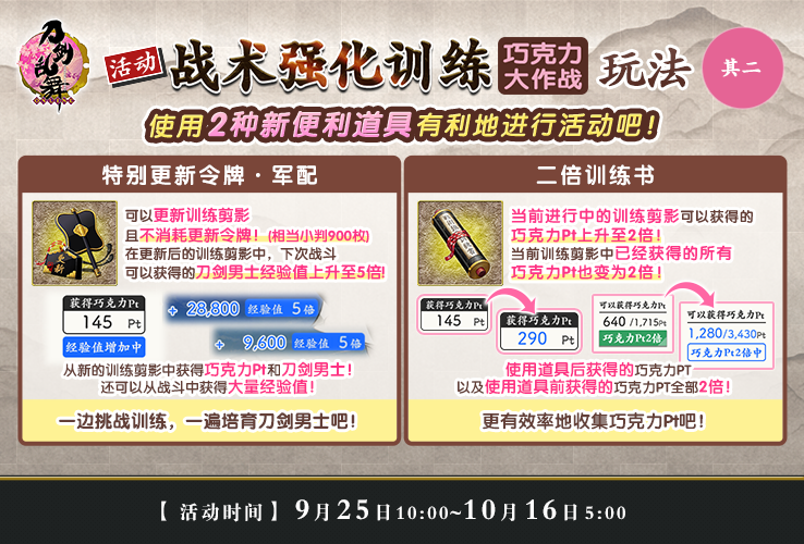 【活动详情】活动期间,万屋将上架「战术强化训练 ~巧克力大作战~」限定活动便利道具「特别更新令牌·军配」「二倍训练书」。