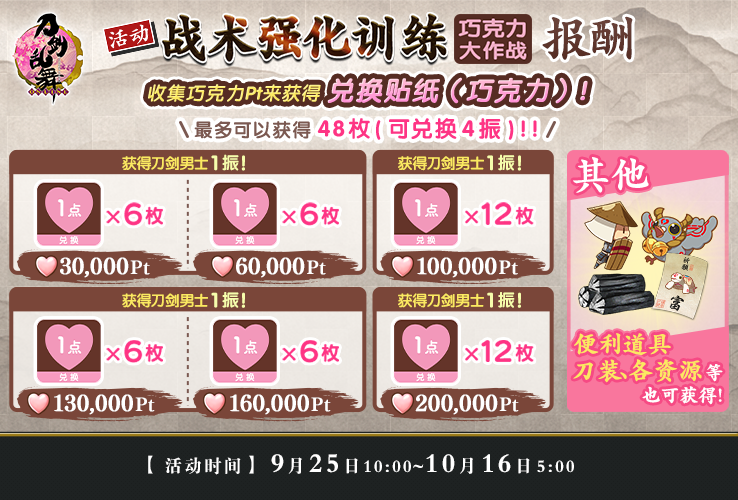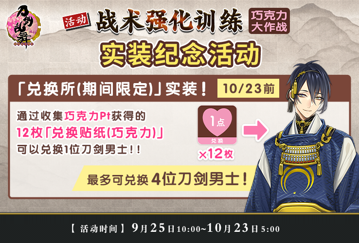 2025年10月23日前,通过收集「巧克力Pt」获得的12枚「兑换贴纸(巧克力)」可以兑换1位刀剑男士,活动期间最多可以兑换4位刀剑男士。