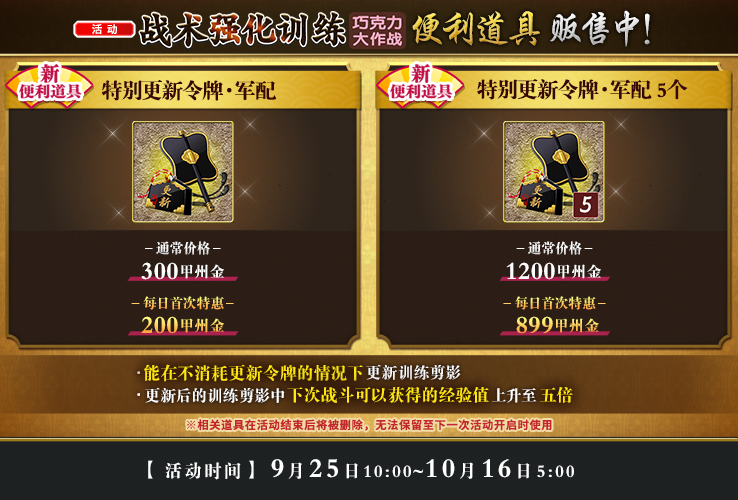 ※「特别更新令牌·军配」「二倍训练书」在本次活动结束后将被删除,无法保留至下一次活动开启时使用。