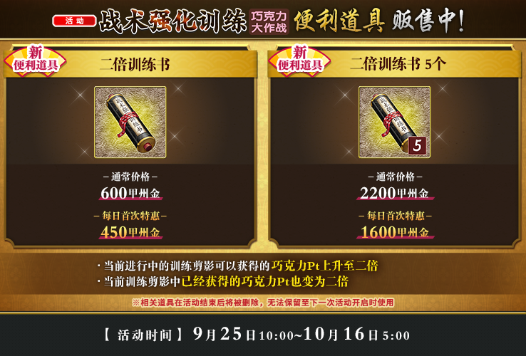 「二倍训练书」单个原价600甲州金,每日首次购买特惠450甲州金。