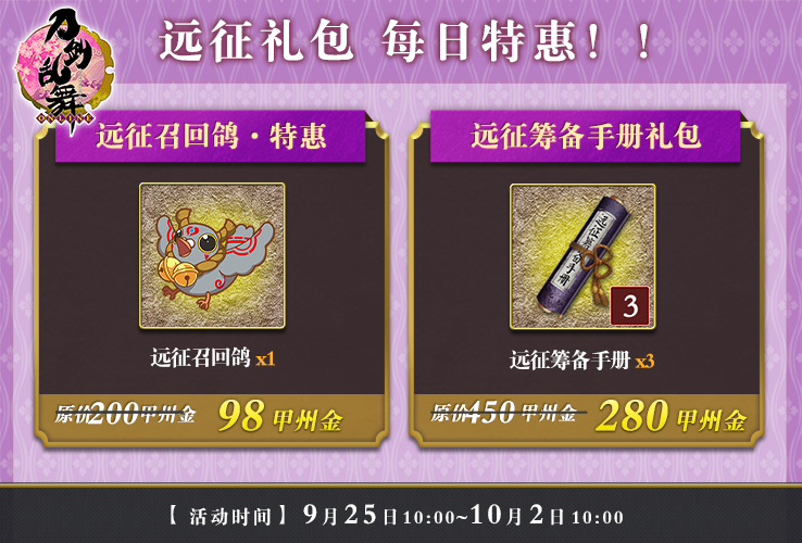 同时,2款特惠远征礼包在「万屋-特卖」限时售卖中,欢迎审神者前往万屋购买。