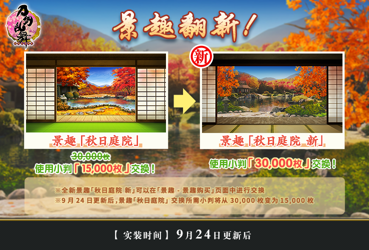 ※景趣「秋日庭院」交换所需小判将于更新后变为15000枚。