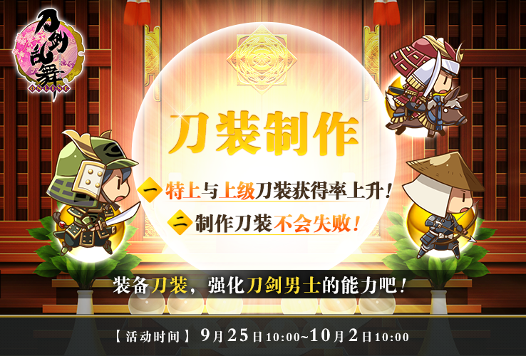 【活动详情】活动期间,特上刀装与上级刀装获得率上升,并且制作刀装不会失败。通过装备优良刀装,强化刀剑男士的能力吧!