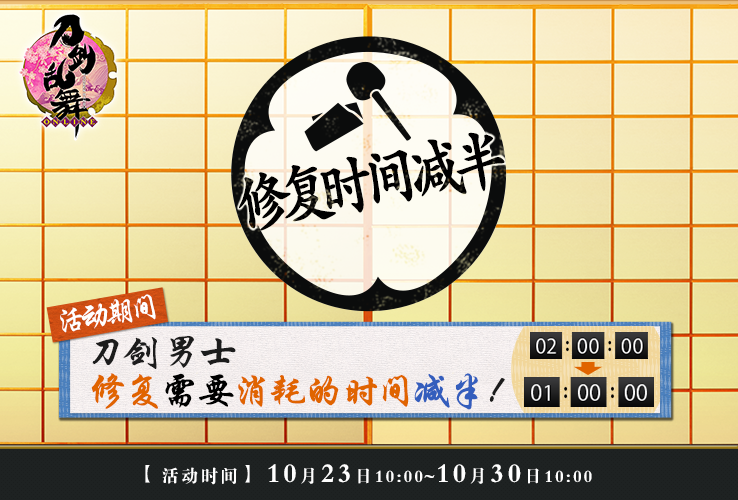 【活动详情】活动期间,刀剑男士修复所需要消耗的时间减半。合理安排进行战力修复吧。