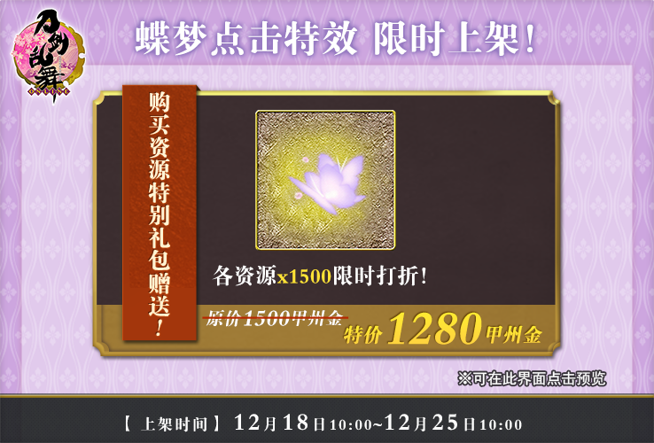 前往「万屋-特卖」购买「蝶梦资源礼包」,即可获得各资源*1500,并额外获赠限定特色点击特效「蝶梦」。「蝶梦资源礼包」原价1500甲州金,限时特价1280甲州金,最多可购买1次。