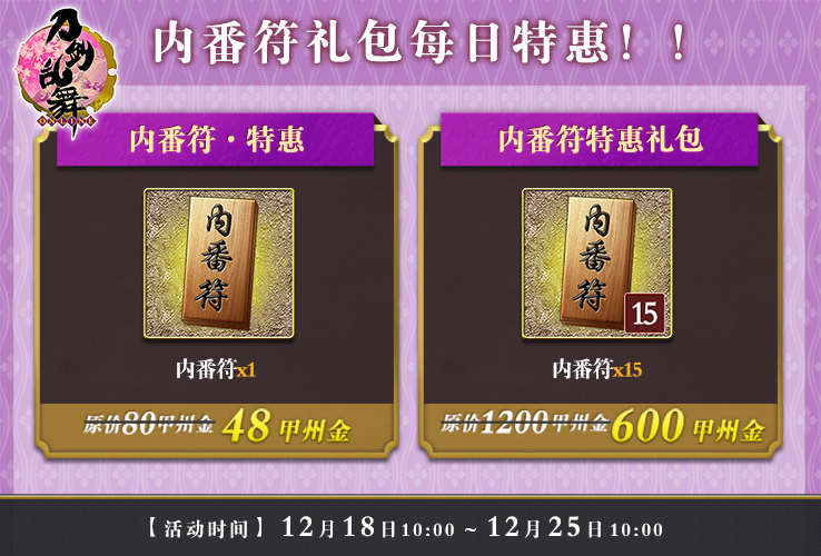 「内番符·特惠」含内番符*1,原价80甲州金,每日首次购买特惠价48甲州金。