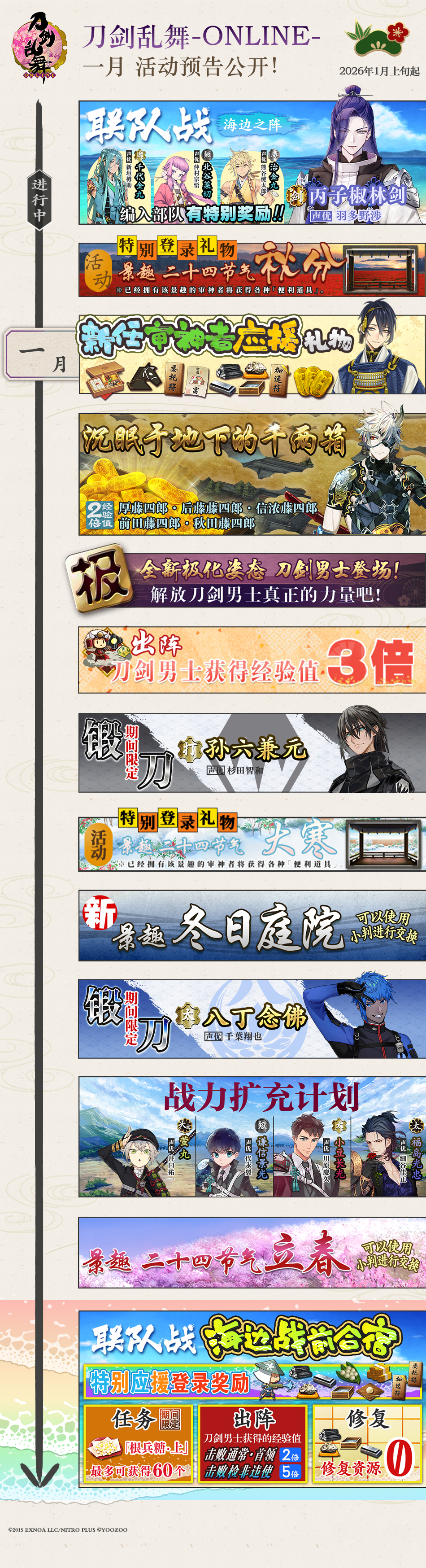 一月活动预告 「新任审神者应援礼物」发放开启,「沉眠于地下的千两箱」活动限时登场!