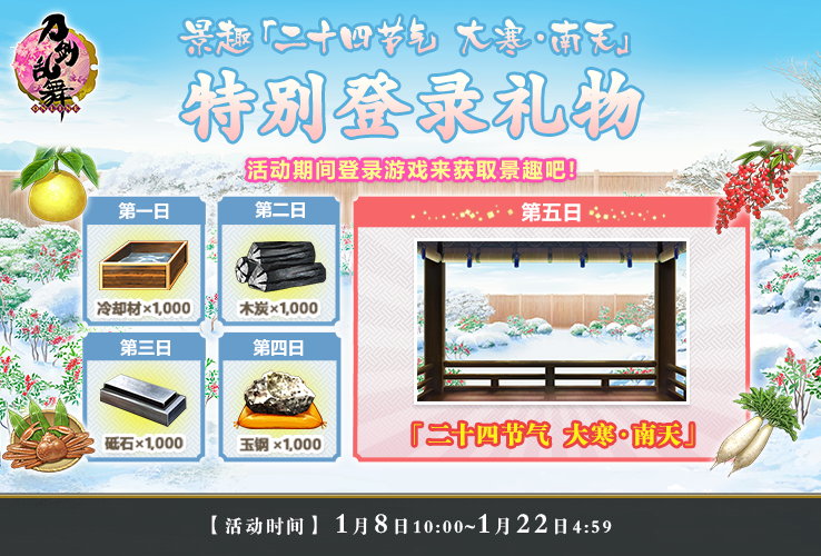 ※若审神者已经拥有景趣「二十四节气 大寒·南天」,第5日累计登录奖励将替换为:小判箱·大*3、加速符·极*2、委托符*2。