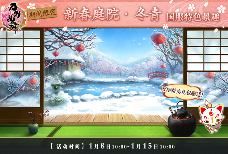 前往「万屋-特卖」购买「冬青资源礼包」,即可获得各资源*3000,并额外获赠中文版原创特色景趣「新春庭院·冬青」。「冬青资源礼包」原价3000甲州金,限时特价1580甲州金,最多可购买1次。