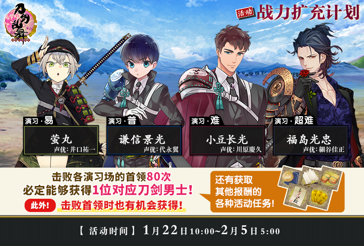 同时,击破各演习场首领并通关,还有机会获得「太刀·三日月宗近」「太刀·小狐丸」「太刀·一期一振」「太刀·鹤丸国永」「太刀·莺丸」「太刀·江雪左文字」和「大太刀·萤丸」等稀有刀剑男士。