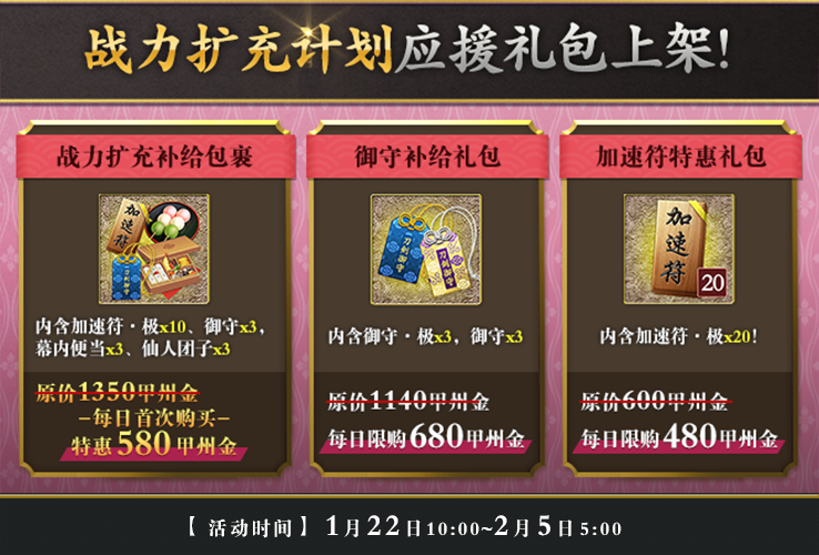「战力扩充补给包裹」内含加速符·极*10、御守*3、幕内便当*3、仙人团子*3,原价1350甲州金,每日首次购买特惠580甲州金。