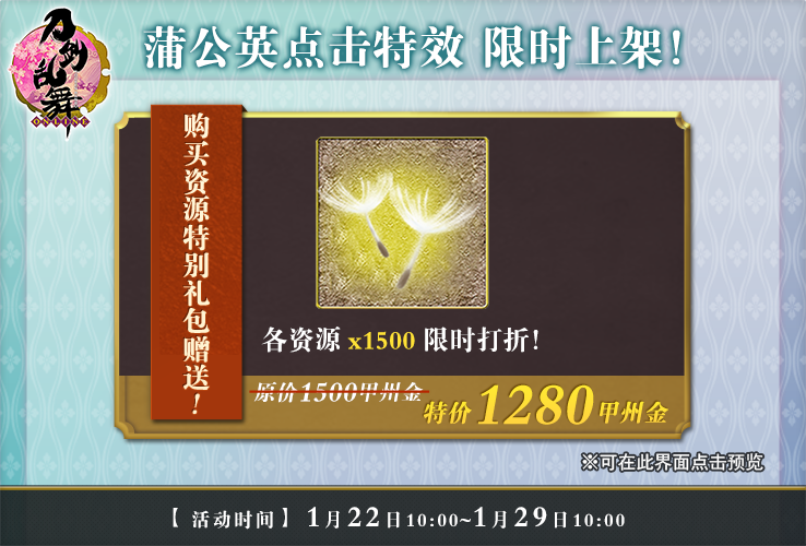 前往「万屋-特卖」购买「蒲公英资源礼包」,即可获得各资源*1500,并额外获赠中文版限定特色点击特效「蒲公英」。「蒲公英资源礼包」原价1500甲州金,特别售价1280甲州金,最多可购买1次。