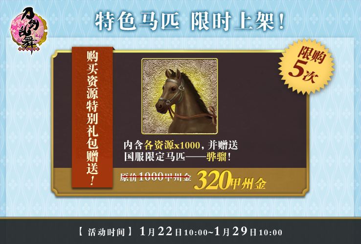 【活动详情】活动期间,中文版限定马匹「骅骝」资源礼包限时回归,登场万屋。前往「万屋-特卖」购买「骅骝资源礼包」,即可获得各资源*1000,并额外获赠中文版限定马匹「骅骝」。「骅骝资源礼包」原价1000甲州金,限时优惠320甲州金,活动期间最多可购买5次。