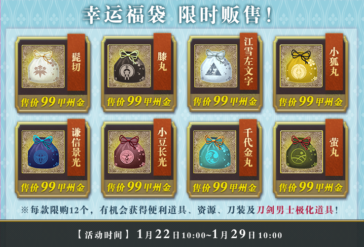 开启专属极化道具幸运福袋,有机会获得便利道具、资源、刀装和刀剑男士专属极化道具。幸运福袋售价99甲州金/个,限购12个,开启全部12个福袋将必得一套对应刀剑男士的专属极化道具。