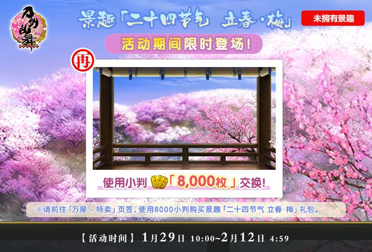 活动期间,审神者可以前往「万屋 – 特卖」页签,使用8000小判购买景趣「二十四节气 立春·梅」礼包,即可获得该景趣。