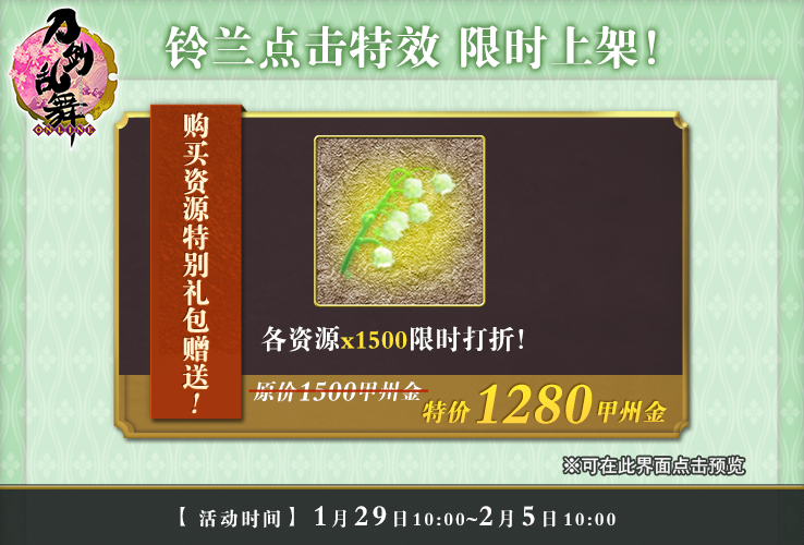 前往「万屋-特卖」购买「铃兰资源礼包」,即可获得各资源*1500,并额外获赠中文版限定特色点击特效「铃兰」。「铃兰资源礼包」原价1500甲州金,特别售价1280甲州金,最多可购买1次。