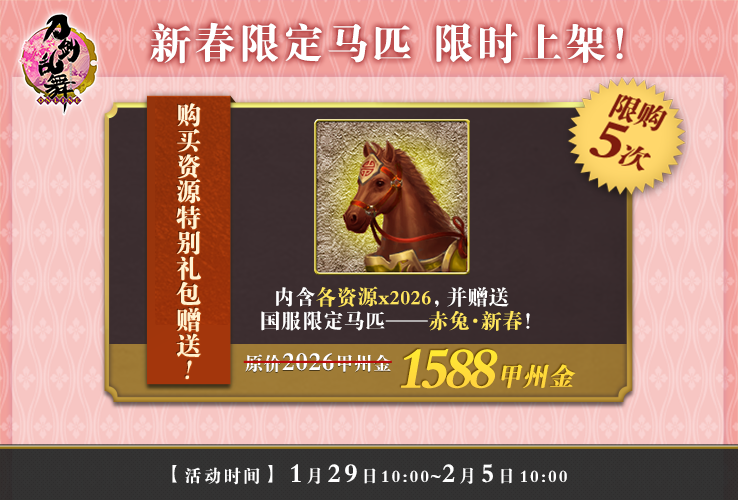 前往「万屋-特卖」购买「赤兔新春资源礼包」,即可获得各资源*2026,并额外获赠中文版限定高属性新春马匹「赤兔·新春」。「赤兔新春资源礼包」原价2026甲州金,回归超低价1588甲州金,活动期间最多可购买5次。