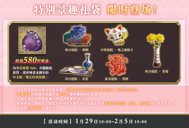 ♡ 「特别景趣礼袋」原价680甲州金,本次特价580甲州金,内含各资源*680,购买后能随机获得1款审神者未拥有的中文版「限定特别景趣」。