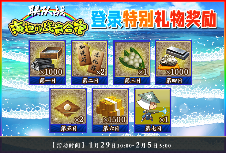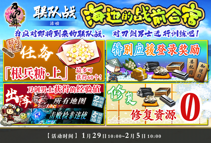 1月29日更新公告 「联队战 ~海边的战前合宿~」活动开启 限时制作新春限定刀装