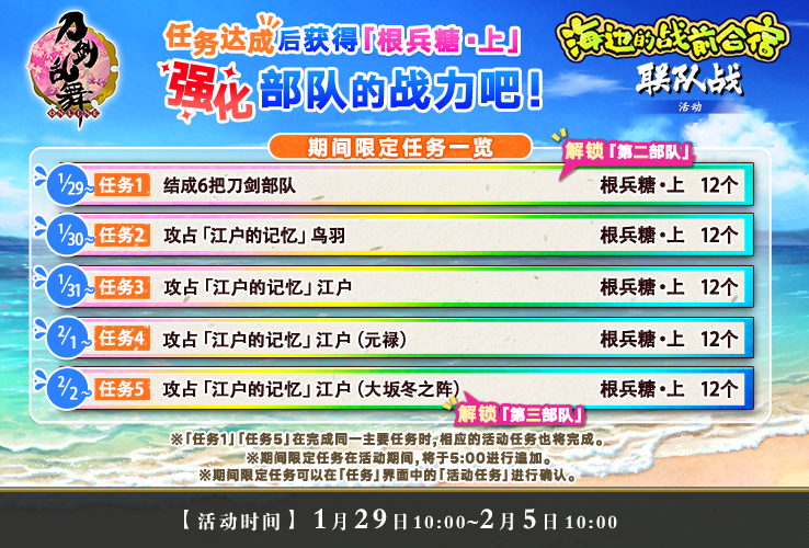 1月29日起完成任务1:结成六把刀剑部队,可获得「根兵糖·上」*12;