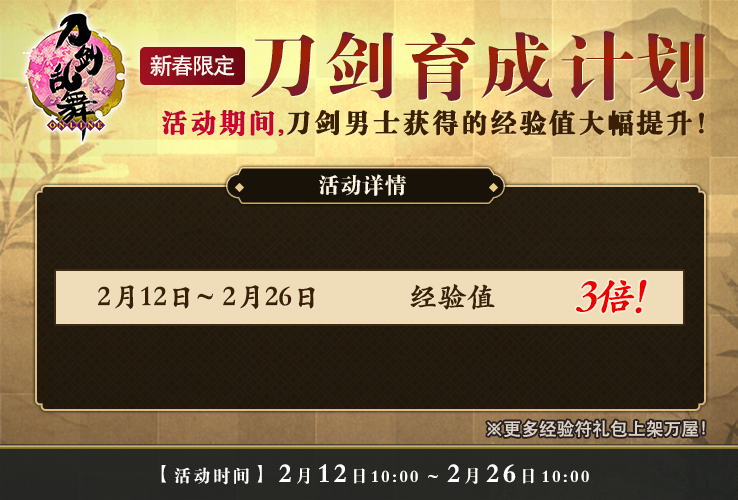 【活动详情】为庆贺新春佳节,特此开启超长时间3倍经验刀剑育成活动!