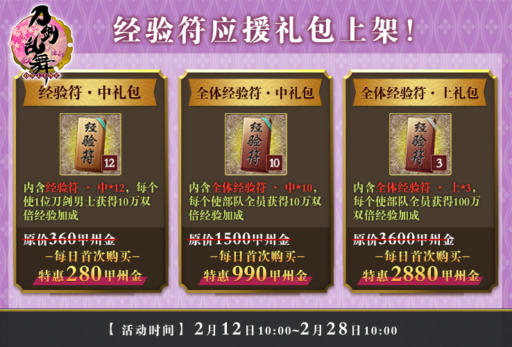 同时,3款经验符礼包上架万屋,搭配使用能够助力刀剑男士更快成长!