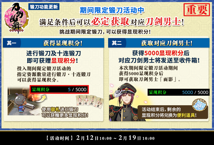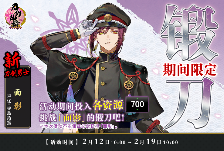 2月12日更新公告 全新刀剑男士「面影」登场期间限定锻刀活动 「超长三倍经验育成计划」限时开启