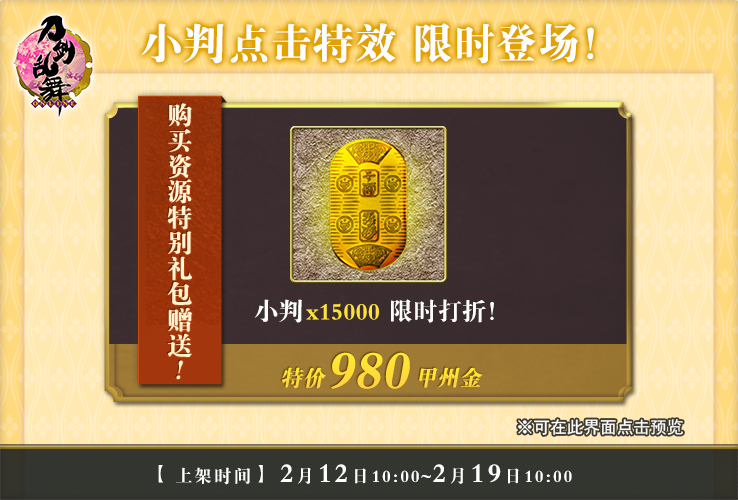 前往「万屋-特卖」购买「小判点击资源礼包」,即可获得小判*15000,并额外获赠限定特色点击特效「小判」。「小判点击资源礼包」原价1500甲州金,新春史低特惠980甲州金,最多可购买1次。