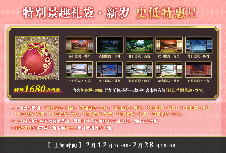 ♡ 「特别景趣礼袋·新岁」原价1980甲州金,本次特价1680甲州金,内含各资源*1980,购买后能随机获得1款审神者未拥有的中文版「限定特别景趣·新岁」。