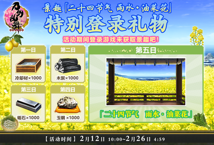 ※若审神者已经拥有景趣「二十四节气 雨水·油菜花」,第5日累计登录奖励将替换为:小判箱·大*3、加速符·极*2、委托符*2。